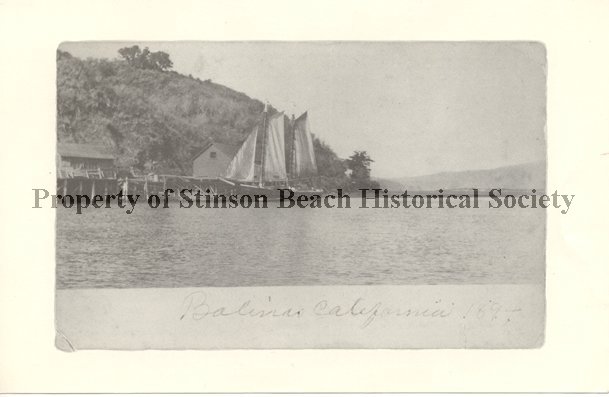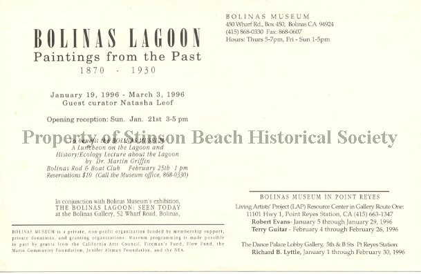 An invitation card for the Bolinas Museum show titled "Bolinas Lagoon, Paintings from the Past, 1870-1930" The front of the card shows a painting of a schooner docked at the Bolinas wharf probably painted from spit of Stinson Beach. It is written under it, Bolinas, California 1894. The Show was held January 19 to March 3, 1996.