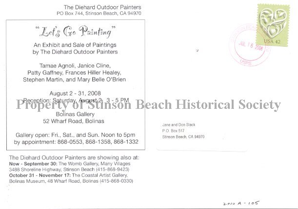 An invitation card to a painting show by the local group called Diehard Outdoor Painting Club. The show was titled, "Let's Go Painting" and held at Bolinas Gallery in the August of 2008. The artists involved were: Tamae Agnoli, Janice Cline, Patty Gaffney, Frances Healey, Mary Belle O'Brien, and Stephen Martin. This particular invitation was sent to Jane and Don Slack. The front side of the invitation shows 6 representative paintings by the artists and the back has information about the gallery, dates and time.