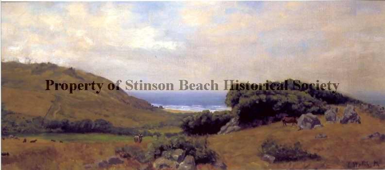A color digital photo print of a painting by Thaddeus Welch in 1893. The original painting is in the collection of Bolinas Museum. The painting is titled 'Bolinas Beach' since this area was all part of the Rancho Bolinas at that time. It depicts greenish late spring hills and the green grass valley opening to the beach with "rocks." The Rocks are at the southern end of Stinson Beach (placement of the rocks suggest the wet green area is near the existing Community Center). A group of cows and a steer can be seen in the green valley. The hill on right hand side is rocky with Bay trees growing on it. The hill on left hand side is where Highway 1 is now. The old Sausalito-Bolinas Road, the predecessor of Highway 1, is visible on the hillside. Between the hills the blue of the ocean with white surf captures our attention. The sky which covers nearly half of the canvas has pinkish white clouds.