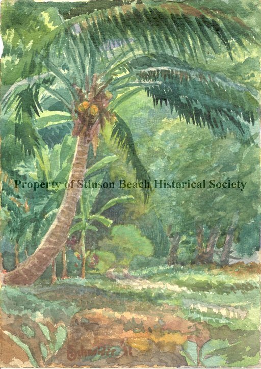 A watercolor painting of a very lush green landscape with a coconut tree in front and banana plants and green trees on the background. The painter's signature, Schneider '31, is painted in a brown-orange tone on the lower center of the painting. On the back of the painting, written in pencil, is "Schneider - Stinson Beach Artist - Nina purchased his house after his death." Nina is probably one of the Pepper family who still owns the house and who also owned house next door down the hill. It is framed in glass with clips. On the back of frame, a 3x5 card is attached with the note: Original Watercolor by ..... Schneider ca.1931 signed. Gift to Helen Bever, she gave it to her son Barney Bever who donated it to the Stinson Beach Historical Society on 4/10/09.