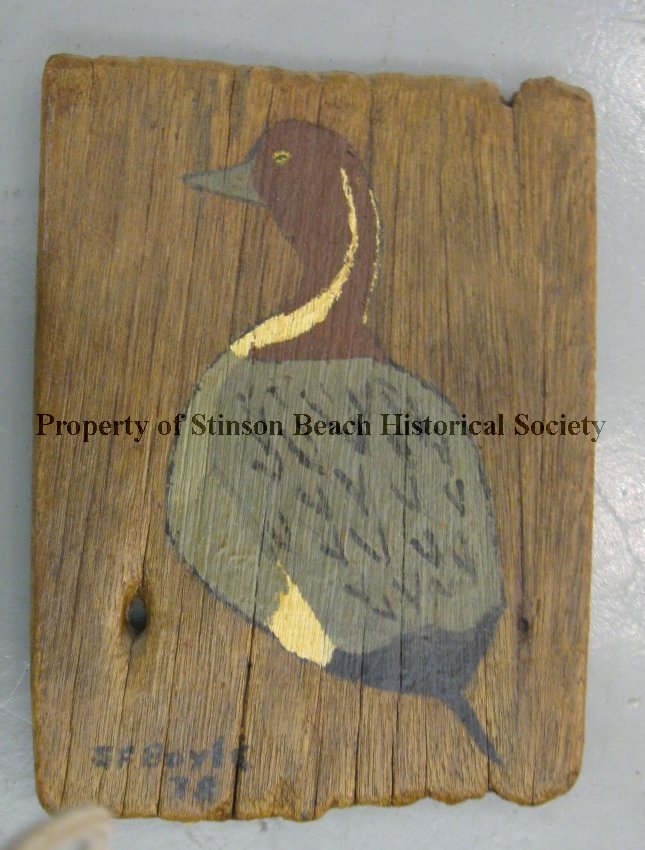 Sitting Pintail duck seen mainly from behind with its head turned to the side so it is in profile. Rust colored head and neck with a yellowish stripe running from the top of its head all the way down its neck on either side. Grayish back with v-shapes painted on it. The wing has yellow tip same color as stripe down its neck. Gray beak. Yellow eye. Painted on square of driftwood board. Signed S.F. Boyle 78