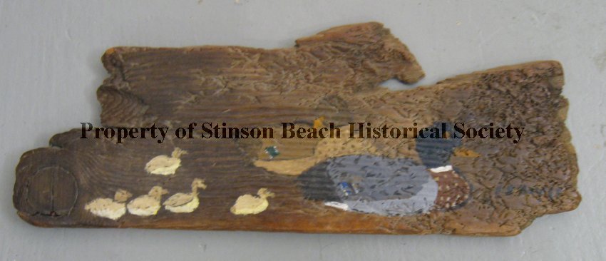 A pair of mallards seemingly drifting on the water followed by 5 yellow ducklings - 4 in a row and one slightly apart and above. The mallard in the front is bluish gray with a black head and tail. Its back is dark gray and mottled, its underbelly is a light gray. Its breast in brown and spotted. There is a blue splotch on the wingtip. The other mallard is 3 shades of brown - darker head and tip of tail, softer back and orangish tan belly and breast. It also had a spotch of blue on its wingtip. S Boyle signature barely visible in blue lower right.