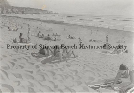 This is a photo of a painting by Michael Knowlton. There is a large sandy beach facing the ocean with several rocks on the shoreline in the background to the left. On the beach are several groups of people in bathing suits stretched out on beach towels in the sand.