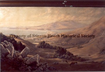 This is a photographic copy of a landscape painting of Bolinas Bay and the hills of Stinson Beach. It shows Bolinas Mesa in the background. Painter unknown.