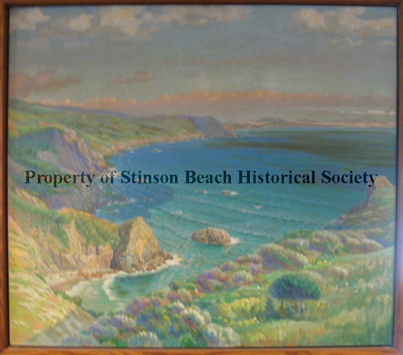 This is a Bruno Schneider landscape. From a scrubby hillside (in shades of green, blue and yellow), above the blue waters and outcroppings of the Steep Ravine cove, the view takes in the extensive coastline toward San Francisco in the distance, which has a pinkish cloud/fog layer suspended above it. Whiter clouds float higher in the blue sky as the fog layer dissipates into the atmosphere. The ocean, more aquamarine in color close to shore, changes to a clear blue and deepens into a shade of sea green the further it goes out.