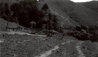 A double dirt track trail runs along the base of and towards a hillside. Slightly higher on the left, separated by weedy growth, is another wider path that has an open swing-type gate across it and wire fencing extending uphill from it. Trees and brush grow at the base of the hill.