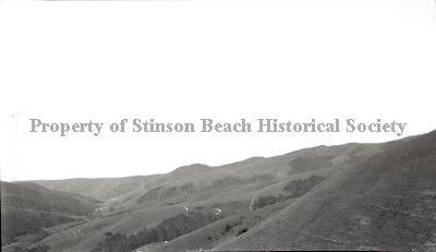 Rolling, sloping hills with copses of trees scattered in the clefts the hills as they slope downward. The view is of Windy Gap from the road below looking up. The base of the hills are known as Frank's Valley.