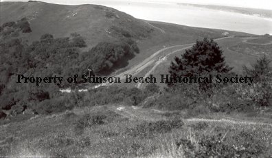 Trail is marked by ruts in the hillside as it extends overland and across the broad terrain. Area is known as Devil's Slide as the trail in the foreground descends steeply before is rises again on the opposite hillside. There are patchs of trees extending from the left to right on otherwise bare hills, except for a lone telephone pole near the base. Bolinas Bay can be seen in the distance.