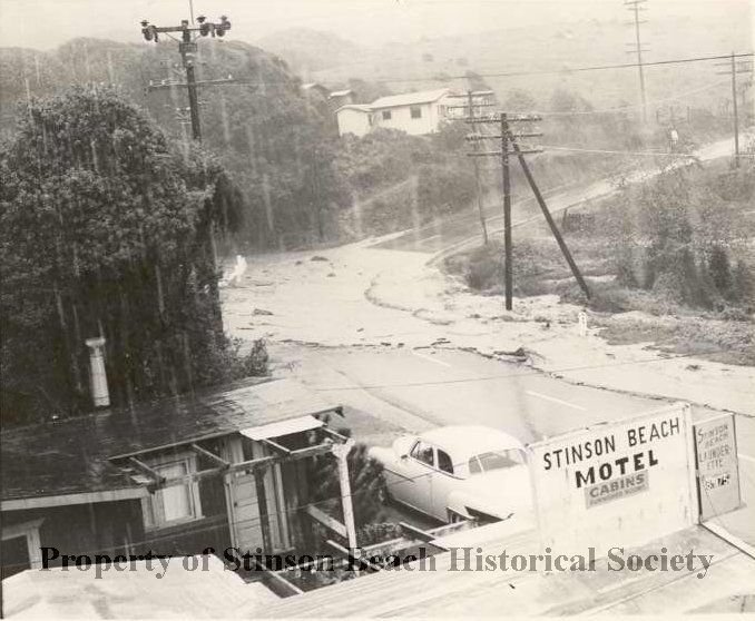 This black and white photograph shows the flood waters of Easkoot Creek inundating the bridge over Highway 1 at the south entrance into town. Stinson Beach Motel is in the foreground.