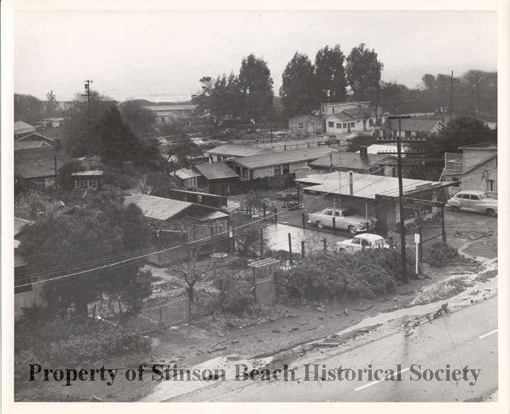 This black and white photograph, taken from Sea Beach Hotel looking across Highway 1, shows downtown area after the 1956 flood. Structures from L to R are: Kurtz's Cottages, Ruth Miller Real Estate, and side of the Seaside Restaurant. See notes.