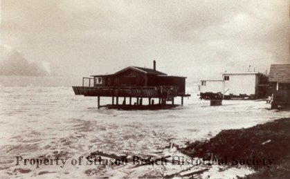 A black and white photograph of Von Kugelgan house (Lee and Nancy Von Kugelgan) , center, and Boyle house, white square house on right standing in stormy surf with debris in front taken during the storm of 1983 by Barrie Stebbings, local photographer who worked for the Coastal Post. Both houses were demolished.