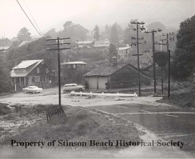 This black and white picture is of Easkoot Creek flooding. The bridge on Hwy. 1 is covered with water. There are buildings behind the swollen creek next to Highway 1 and on the hillside behind. The building on the right with the two large garage doors is the firehouse. Two cars are parked nearby. There are four telephone poles beside the highway on the near side of the creek.