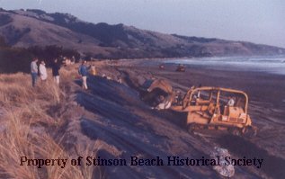 A bulldozer is putting a huge rock on top of the cloth laid on top of the sloped sand. 3,4 people are standing on top of the slope , in the dune grass. Photo is taken looking toward San Francisco. The hills toward San Francisco is on the background and crescent of the beach and sand follows to the toe of the rock wall being built. On the back of the photo reads:6. rocks are put on cloth."