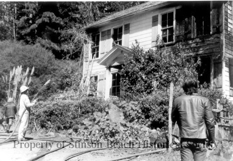 This black and white photograph shows the front of Easkoot House with the right front corner charred and blackened. The house is also burnt outside the left upper window where a ladder is leaning. A man is standing in front of the house holding a hose but no water is issuing from it. In the lower right hand corner a man stands with his back to the camera, looking at the damage.